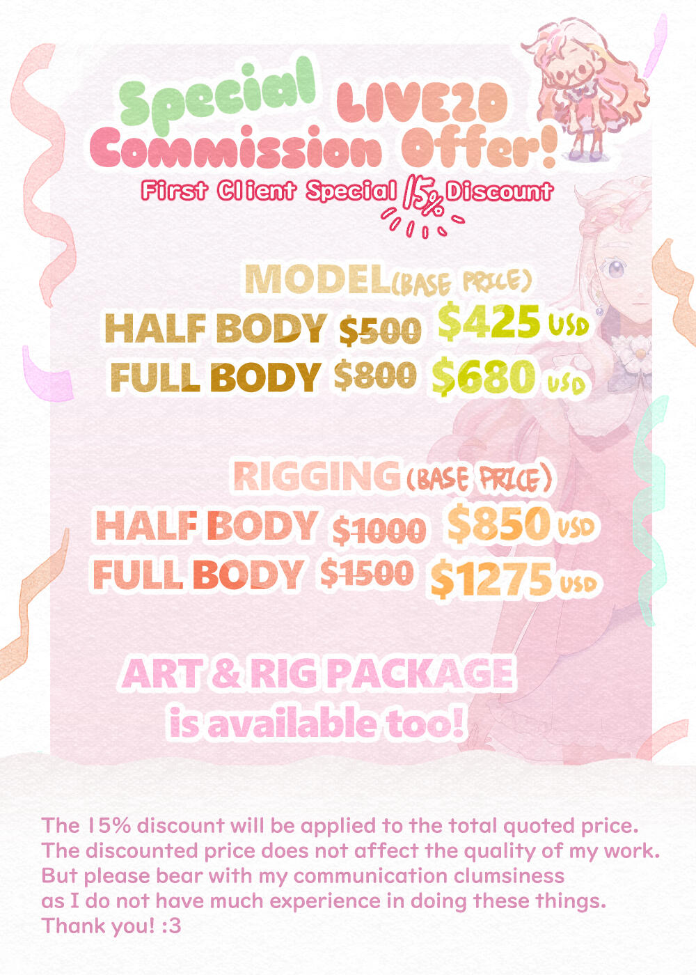 Clients are required to give proper & clear credits for the commissioned artwork.(For Live2D model/rig: Twitter Bio & Streaming Channel;)